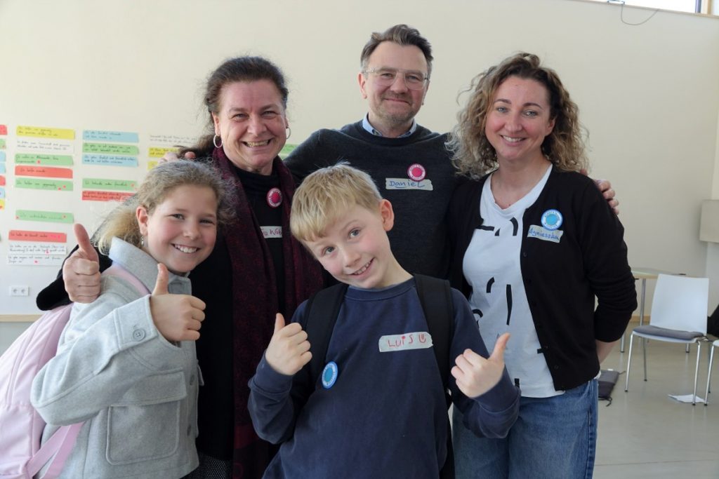 Eindrücke vom Delegiertentreffen des Leitsätze Prozess. Foto 2, von links oben: Eva Wobido (Schulleitung Grundschule Helmut-Schmidt-Allee), Daniel Send (lokaler Bildungsmanager Freiham) , Agnieszka Papierowski (lokale Bildungsmanagerin Neuaubing/Westkreuz) und zwei Grundschüler*innen