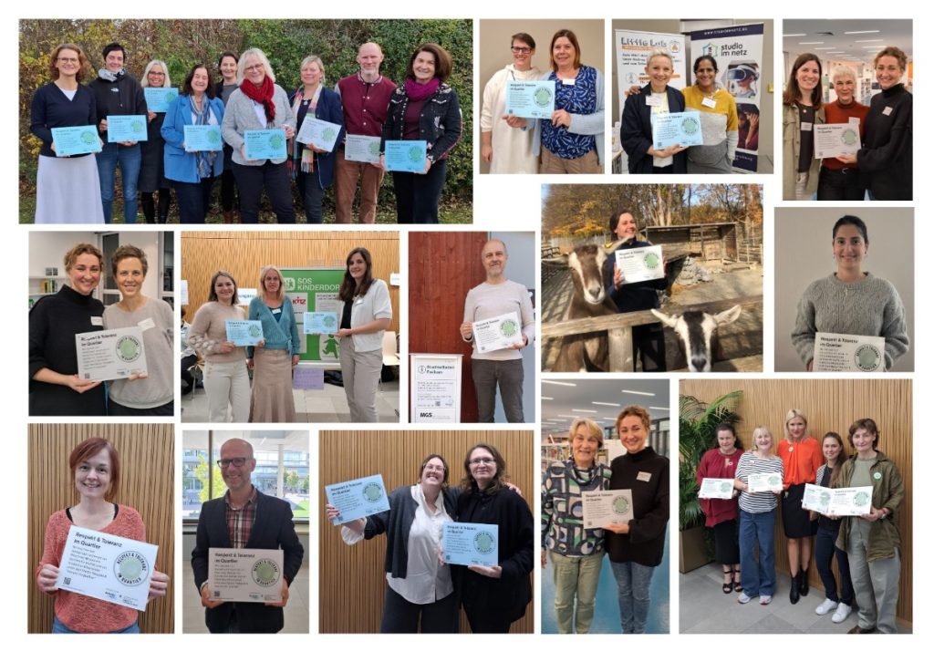 Die zahlreichen Beteiligten Einrichtungen haben zum vorläufigen Projektabschluss Plaketten für ihre Einrichtungen erhalten, mit denen das Engagement für die gleichen Werte des Zusammenlebens im Rahmen des Formats auch in den Einrichtungen deutlich sichtbar gemacht werden können (hier nur eine kleine Auswahl der Beteiligten).